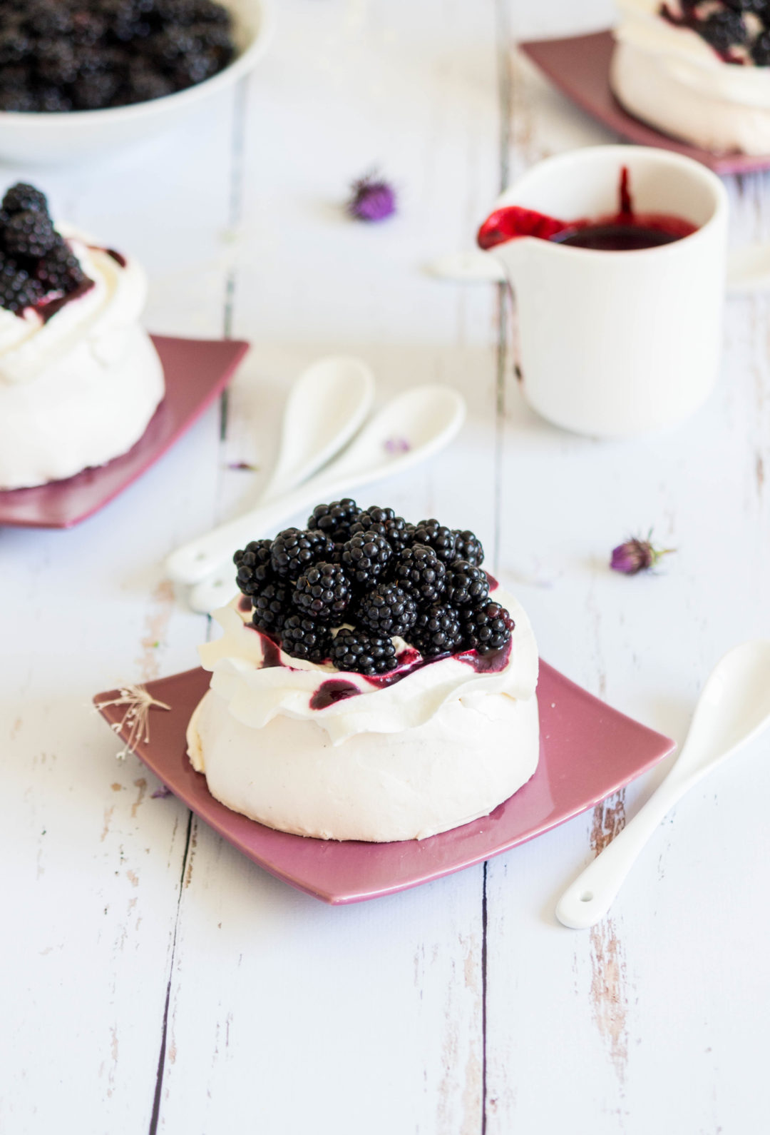 L’arrivée des mûres sur les ronces sonne la fin de l’été, l’heure de la rentrée… Ce fruit sauvage me rappelle mon enfance. Je me souviens de ces grandes promenades que je faisais à travers ma campagne natale. Elles étaient ponctuées en cette saison de petites pauses gourmandes où je savourais les mûres qui ornaient les haies des prés. Amoureuse de la nature, j’ai fait le choix d’habiter à la campagne et je ne me verrais vivre nul par ailleurs. Je continue à manger les mûres lors de nos ballades familiales mais j’aime aussi beaucoup les manger comme je le faisais autrefois avec un peu de crème fraîche et du sucre. Et c’est comme ça que j’ai eu l’idée de ces petites pavlovas. Je cherchais une idée de dessert à base de mûres et l’association avec la chantilly (crème + sucre) et la meringue m’est apparue comme une évidence. J’ai donc missionné mes deux Gourmands qui sont allés me récolter un gros panier de mûres. Quel plaisir de voir ma petite Gourmande les engloutir comme je le faisais enfant ! Heureusement, elle m’en a laissé juste assez pour préparer un bon coulis et ces petites merveilles.