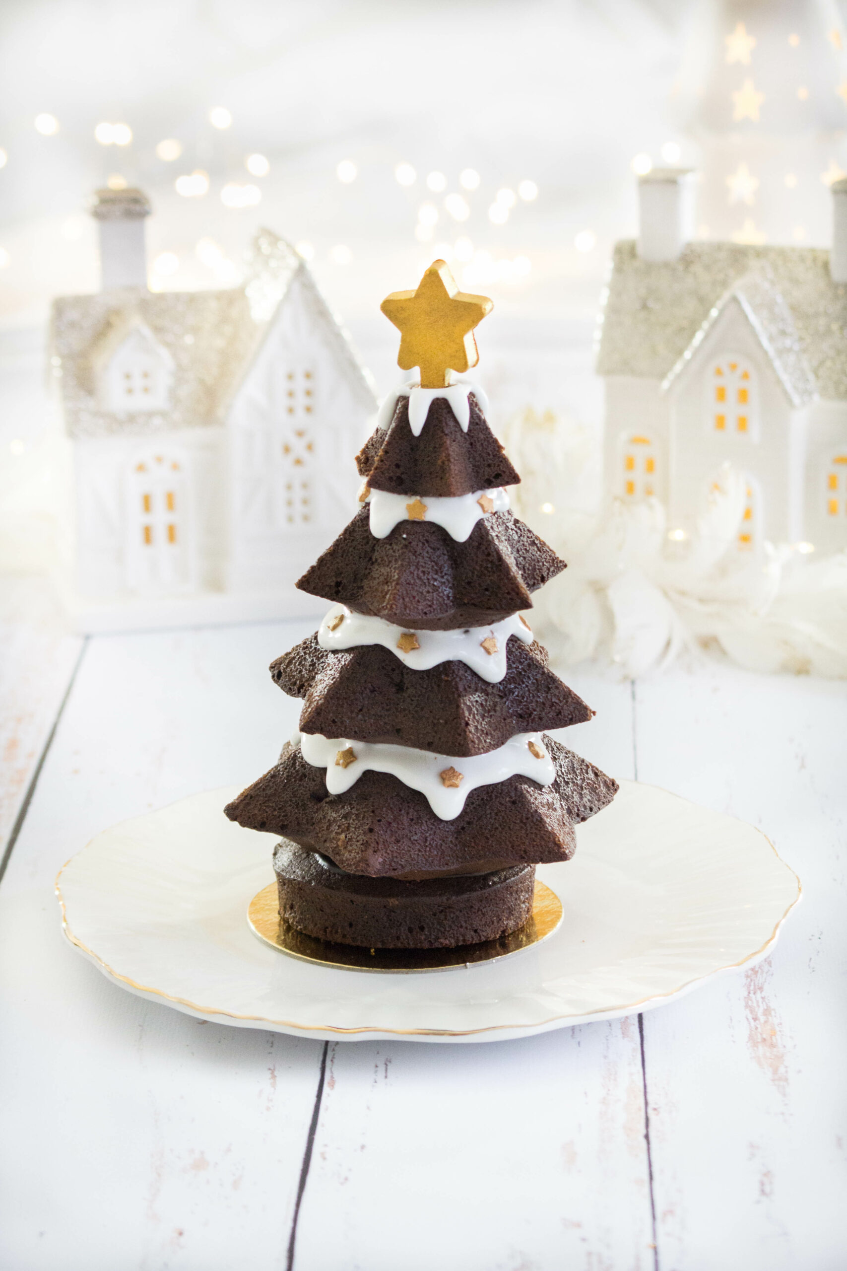 J’ai étudié la question et choisi un gâteau au chocolat moelleux mais assez compact, en adaptant la cuisson selon la taille des différents moules. J’ai procédé par étapes, en cuisant deux gâteaux à la fois. Pour assembler le tout, j’ai préparé une petite ganache au chocolat. Au sommet, j’ai ajouté une étoile en chocolat réalisée avec le moule, et comme il me restait un peu de bombe alimentaire dorée, j’en ai profité pour la colorer. Un léger glaçage royal pour l’effet « neige »… et le tour était joué !