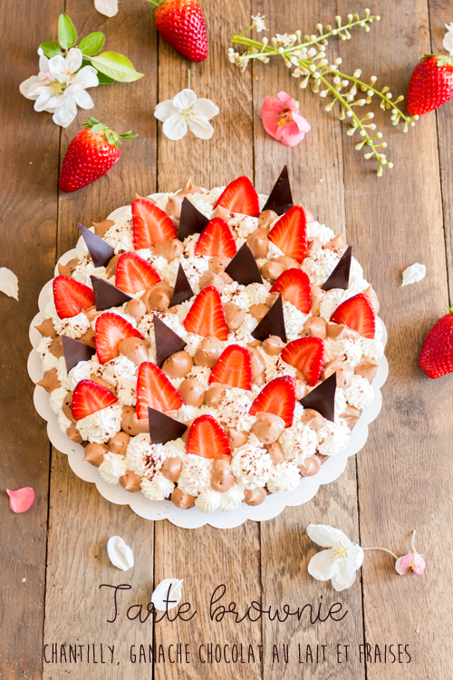 Ce week-end c’est Pâques et je suis sûre que vous avez un repas de famille de prévu. Je me trompe? Mais avez-vous déjà trouvé votre dessert? Et bien si vous n’en avez pas encore, j’ai ce qu’il vous faut! Voici tout droit tiré de mon imagination, une tarte brownie avec de la chantilly, de la ganache montée au chocolat au lait et des fraises fraîches. Cette idée de recette m’est venue tout simplement parce que j’avais très envie de manger un gâteau au chocolat avec de la chantilly. Alors je me suis dit que la base de mon gâteau pourrait être un brownie car j’adore son fondant. Et puis, comme les fraises nous font l’honneur d’être déjà sur les étales autant ne pas s’en priver! Elles apportent le petit côté fraîcheur. La chantilly et la ganache au chocolat au lait c’est juste une question de gourmandise… Et pas question de vous découragez car cette tarte est très simple à réaliser! On prépare la ganache la veille et on la monte le lendemain. Le brownie peut aussi être fait la veille. Du coup, il ne reste plus qu’à faire une chantilly, coupez les fraises et faire le montage le jour J. Quand au décor en chocolat, j’ai juste fait fondre du chocolat noir pâtissier que j’ai étalé sur du rhodoïd. J’ai attendu qu’ils prennent un peu pour former mes triangles au couteau. Quelques heures au réfrigérateur et le tour était joué! Simplissime!